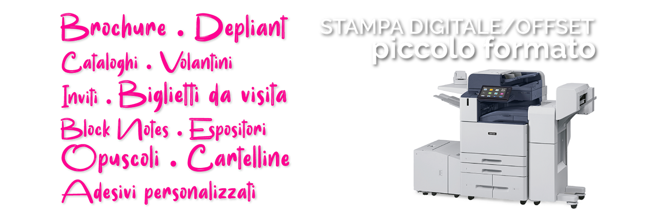 Nel corso degli anni la nostra azienda ha seguito il rapido evolversi del mercato, sia sotto l’aspetto produttivo, con la stampa digitale e plotterata, sia sotto l’aspetto professionale, con un reparto grafico presso il quale potete trovare un valido punto di riferimento ed un suggerimento creativo per poter sviluppare al meglio i vostri progetti.
